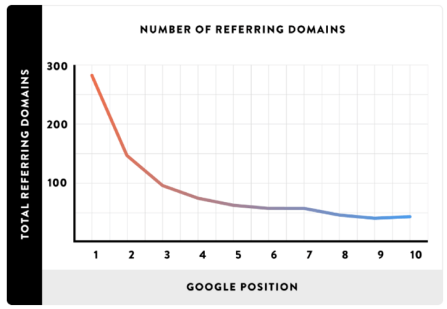 Flere undersøgelser viser, at der er en korrelation imellem antallet af refererende domæner og placeringen på Google. I en undersøgelse af Brian Dean fandt man for eksempel frem til netop ovenstående sammenhæng (se nedenstående graf).